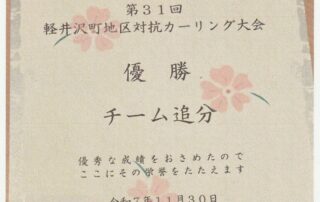 11月30日(日)、軽井沢町地区対抗カーリング大会が風越公園アイスアリーナで行われ、“チーム追分”が見事優勝を飾った。佐藤浩平さん( 14組) をリーダー とする5人のメンバーが参加した。